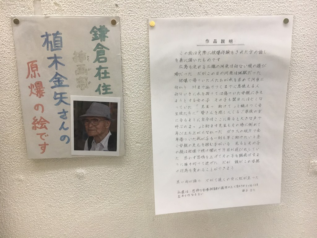 JR鎌倉駅の西口と東口を繋ぐ地下通路の西口側入り口近くに展示ケースが設置されており、挿画家植木金矢の原爆の絵が展示されています。97歳まで現役で劇画作家として活躍した植木金矢は広島や長崎の被爆者からの聞き取りをもとに神が不在の日8.6という原爆の絵を描いています。「このために生かされているのと感じた」という使命感から原爆の絵画を手がけたのだそうです。そのうちの2枚がここに展示してあります。これら作品はユーチューブでも紹介されています。管理人は2018年7月26日に訪れました。現在も展示されているかどうかは不明です。
